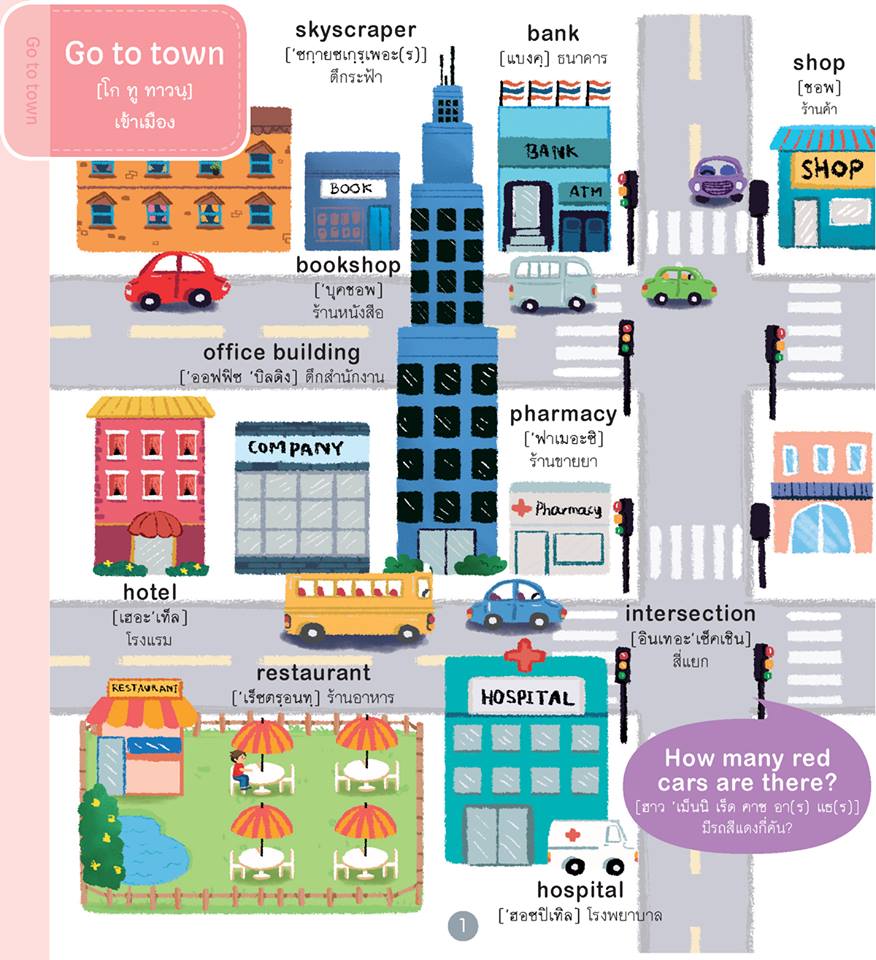 เป็นคำศัพท์เกี่ยวกับการเดินทางเข้าไปเที่ยวในตัวเมือง เด็กๆ จะได้เจอกับตึกใหญ่โต รถยนต์มากมาย ร้านค้าอีกนับไม่ถ้วน และสถานที่น่าสนใจอีกมาก เอ๊ะ ! แล้วสิ่งต่างๆ เหล่านี้เราเรียกขานเป็นคำภาษาอังกฤษว่าอย่างไรนะ ภาพประกอบมีเรื่องราวช่วยให้จำจำคำศัพท์ได้ง่ายยิ่งขึ้น
