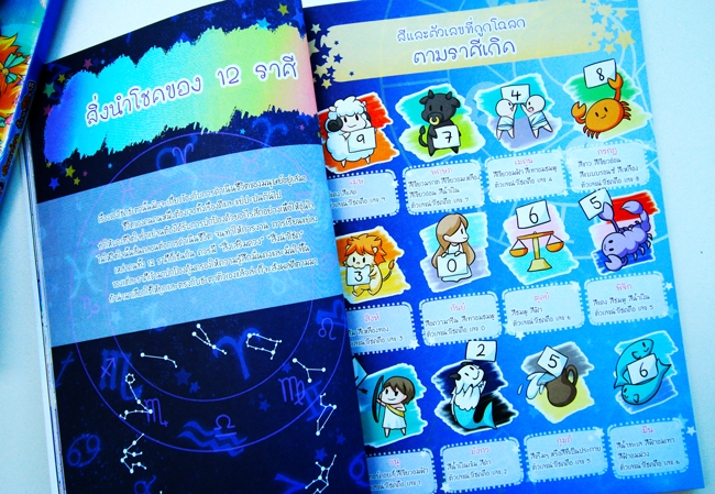 ว่าแต่ ของนำโชคของแต่ละราศีมีอะไรกันบ้างนะ ? ในเล่มนี้มีบอกหมดทุกราศี อย่างอลิซราศีสิงห์มีดาวประจำราศีคือพระอาทิตย์ สีนำโชคก็คือสีส้ม สีเหลืองทอง ของนำโชคก็จะเป็นของจุกจิกสีเหล่านี้ อลิซก็มีปากกาสีทองที่ติดกระเป๋าอยู่ตลอดด้วยล่ะ นอกจากนั้นเขายังบอกเกี่ยวกับตำนานเทพทั้ง 12 ราศี สัตว์นำโชค อาหารเสริมพลัง และสิ่งของเสริมดวงชะตาอีกมากมาย ที่ไม่รู้ไม่ได้แล้ว !!!