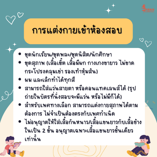 - สามารถใส่แว่นสายตา หรือคอนแทคเลนส์ได้ (รูปถ่ายในบัตรที่นั่งสอบจะมีแว่น หรือไม่มีก็ได้)