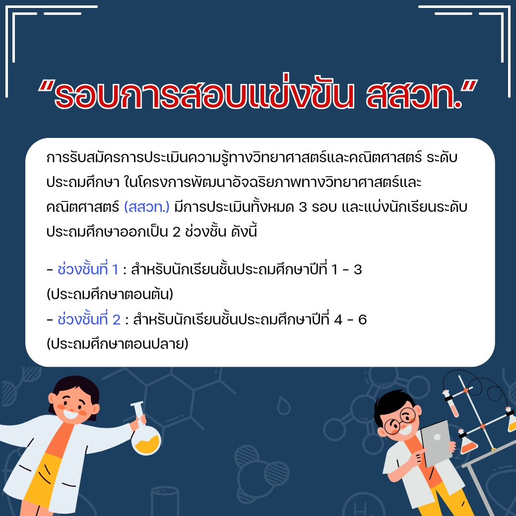 การรับสมัครการประเมินความรู้ทางวิทยาศาสตร์และคณิตศาสตร์ ระดับประถมศึกษา ในโครงการพัฒนาอัจฉริยภาพทางวิทยาศาสตร์และคณิตศาสตร์ (สสวท.) มีการประเมินทั้งหมด 3 รอบ และแบ่งนักเรียนระดับประถมศึกษาออกเป็น 2 ช่วงชั้น ดังนี้