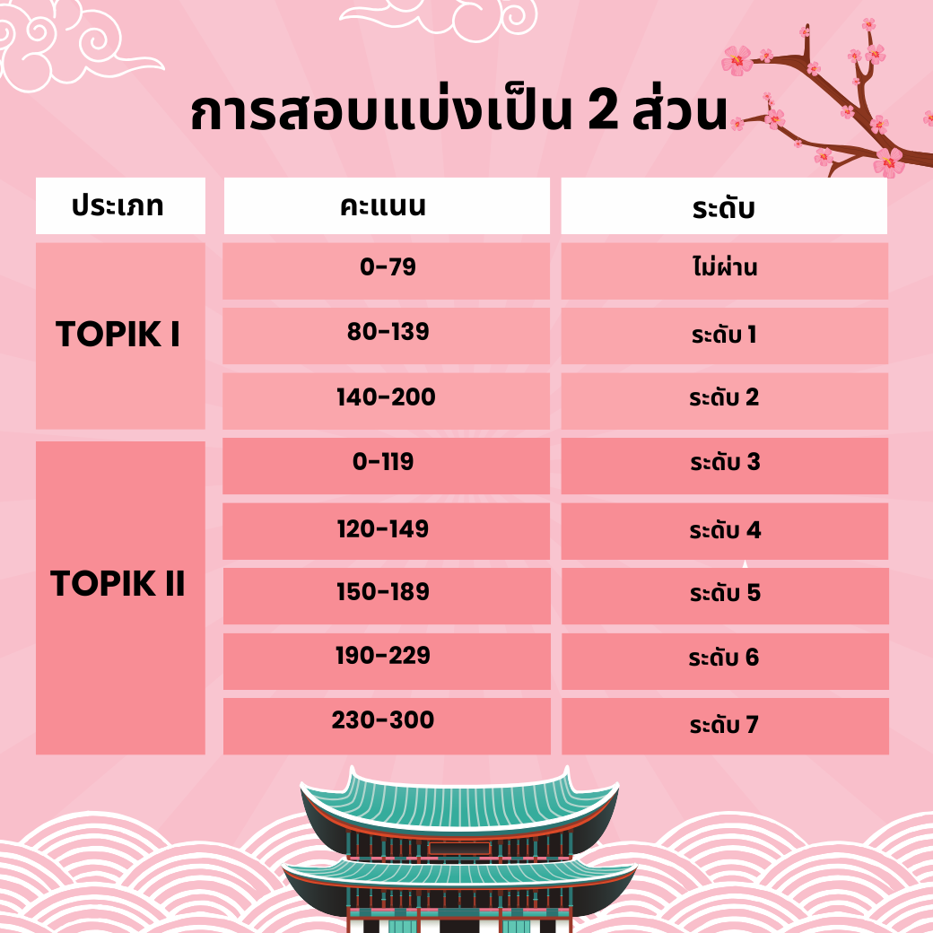 การสอบ TOPIK แบ่งออกเป็นสองประเภท ได้แก่ TOPIK I คะแนนที่ได้แบ่งออกเป็นระดับ 1 และระดับ 2 ส่วนอีกประเภทคือ TOPIK II คะแนนที่ได้แบ่งออกเป็นระดับ 3 ถึงระดับที่ 6 ดังนี้