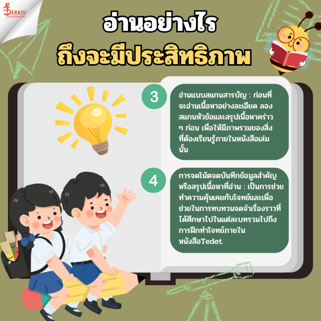 4. การจดโน้ตจดบันทึกข้อมูลสำคัญหรือสรุปเนื้อหาที่อ่าน : เป็นการช่วยทำความคุ้นเคยกับโจทย์และเพื่อช่วยในการทบทวนจดจำเรื่องราวที่ได้ศึกษาไปในแต่ละบทรวมไปถึงการฝึกทำโจทย์ภายในหนังสือ TEDET