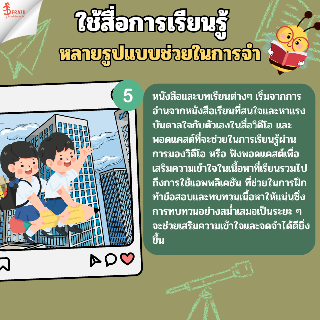 5. ทบทวนหนังสือและบทเรียนต่างๆ : เริ่มจากการอ่านจากหนังสือเรียนที่สนใจและหาแรงบันดาลใจกับตัวเองในสื่อวิดีโอ และ พอดแคสต์ที่จะช่วยในการเรียนรู้ผ่านการมองวิดีโอ หรือ ฟังพอดแคสต์เพื่อเสริมความเข้าใจในเนื้อหาที่เรียนรวมไปถึงการใช้แอพพลิเคชัน ที่ช่วยในการฝึกทำข้อสอบและทบทวนเนื้อหาให้แน่นซึ่งการทบทวนอย่างสม่ำเสมอเป็นระยะ ๆ จะช่วยเสริมความเข้าใจและจดจำได้ดียิ่งขึ้น