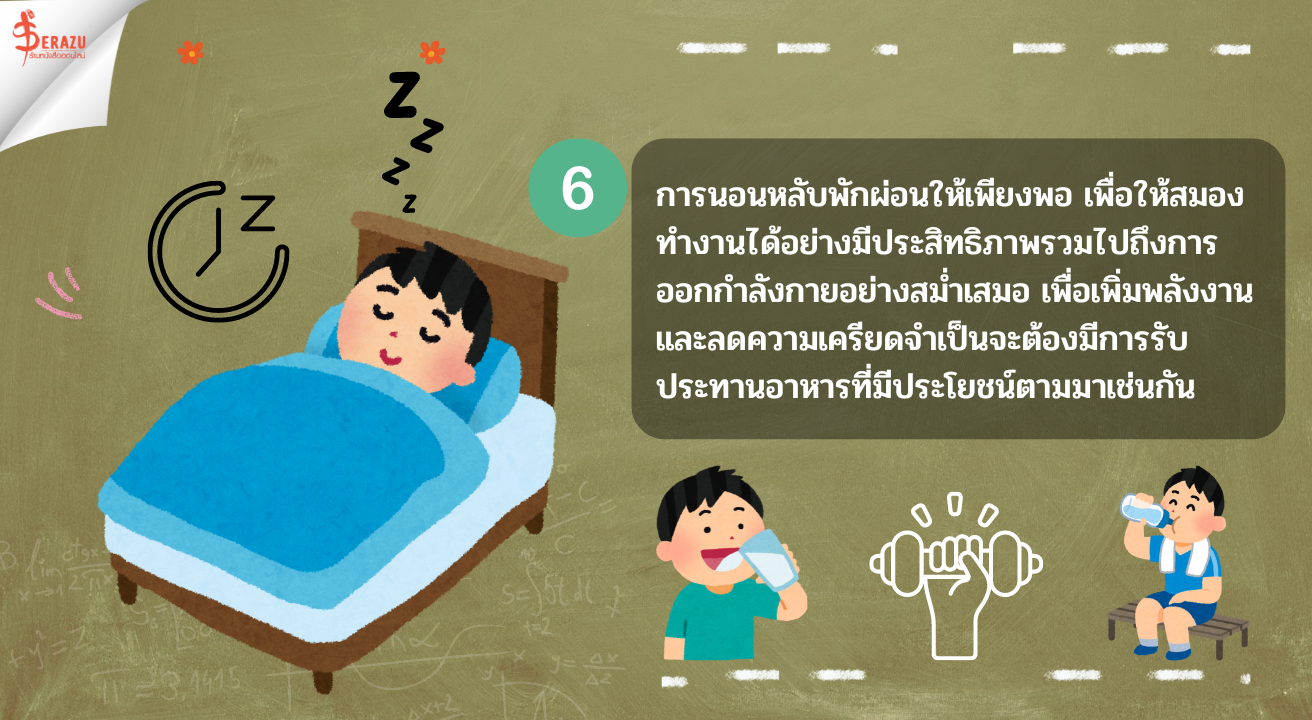6. การดูแลสุขภาพของตนเองเป็นสิ่งสำคัญ :การนอนหลับพักผ่อนให้เพียงพอ เพื่อให้สมองทำงานได้อย่างมีประสิทธิภาพรวมไปถึงการออกกำลังกายอย่างสม่ำเสมอ เพื่อเพิ่มพลังงานและลดความเครียดจำเป็นจะต้องมีการรับประทานอาหารที่มีประโยชน์ตามมาเช่นกัน