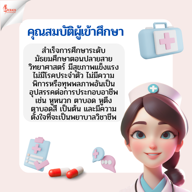 คุณสมบัติผู้เข้าศึกษา สำเร็จการศึกษาระดับมัธยมศึกษาตอนปลายสายวิทยาศาสตร์ มีสุขภาพแข็งแรง ไม่มีโรคประจำตัว ไม่มีความพิการหรือทุพพลภาพอันเป็นอุปสรรคต่อการประกอบอาชีพ เช่น หูหนวก ตาบอด หูตึง ตาบอดสี เป็นต้น และมีความตั้งใจที่จะเป็นพยาบาลวิชาชีพ