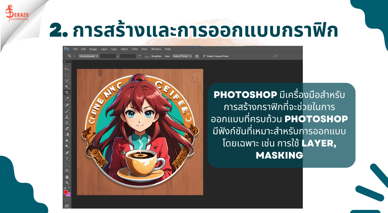 Photoshop มีเครื่องมือสำหรับการสร้างกราฟิกที่จะช่วยในการออกแบบที่ครบถ้วนและง่ายโดย Photoshop มีฟังก์ชันที่เหมาะสำหรับการออกแบบโดยเฉพาะ เช่น การใช้ Layer, Masking, และการสร้างเอฟเฟกต์ต่างๆ ช่วยให้นักออกแบบสร้างสรรค์งานได้ตามต้องการของแต่ละไลฟ์สไตล์