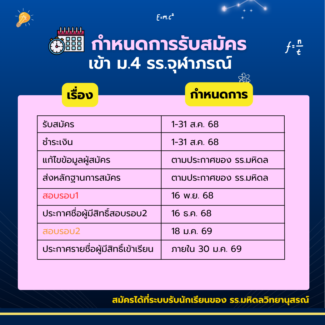 ส่งหลักฐานการสมัคร: ตามประกาศของโรงเรียนมหิดลวิทยานุสรณ์