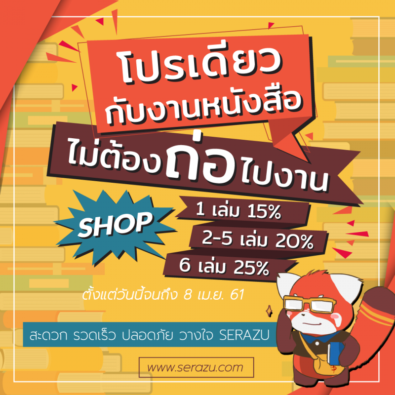 SERAZU ใจป้ำขอกระจายความสุขสู่นักอ่านทั่วประเทศ ใกล้-ไกล ก็ได้โปรโมชั่นเดียวกับในงานสัปดาห์หนังสือแห่งชาติครั้งที่ 46 เอาใจคนอยู่ไกล อำนวยความสะดวกแก่คนไม่อยากเดินงาน ไม่ต้องเบียดให้เหนื่อย ไม่ต้องแทรกฝูงคนจนหมดพลัง เพราะ SERAZU ยกงานสัปดาห์หนังสือระดับชาติให้อยู่ใกล้แค่คลิกนิ้วเท่านั้น งานนี้ไม่ต้องสูญพลังงาน แถมยังได้โปรโมชั่นเดียวกับในงานด้วยนะเอ้อ!!