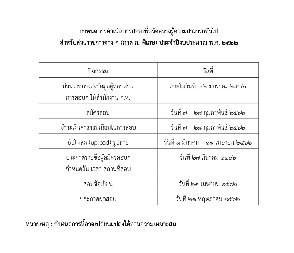 กําหนดการดําเนินการสอบเพื่อวัดความรู้ความสามารถทั่วไป สําหรับส่วนราชการต่าง ๆ (ภาค ก. พิเศษ) ประจําปีงบประมาณ พ.ศ. 2562