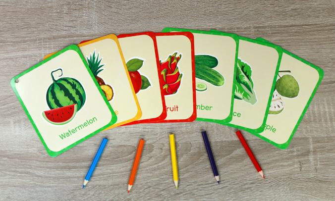 บัตรภาพคำศัพท์ หรือแฟลชการ์ดชุด ผลไม้ และผักน่าทาน ภายในชุดประกอบไปด้วยบัตรภาพคำศัพท์จำนวน 52 แผ่น
