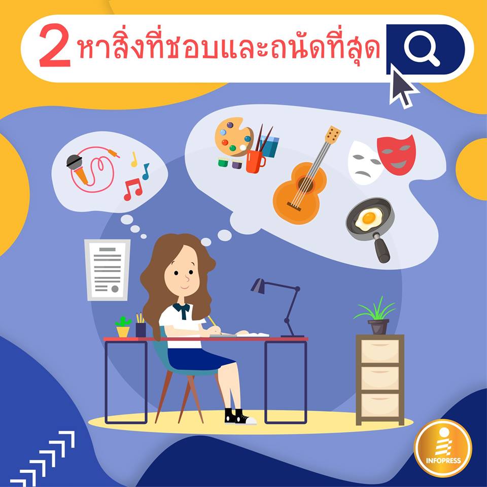 2. หาสิ่งที่ชอบและถนัดที่สุด สิ่งที่เราชอบและสิ่งที่เราถนัดคือด้านไหน ไม่มีใครจะตอบคำถามนี้ได้ดีเท่าตัวเราเอง และถ้าให้ดีหาเผื่อไปถึงความสามารถพิเศษเลยก็ได้ จดไว้ให้เยอะที่สุด เช่น ชอบวาดภาพ ชอบร้องเพลง ชอบทำอาหาร ชอบการแสดง ฯลฯ สิ่งเหล่านี้สามารถต่อยอดไปทั้งการเรียนและการทำงานได้