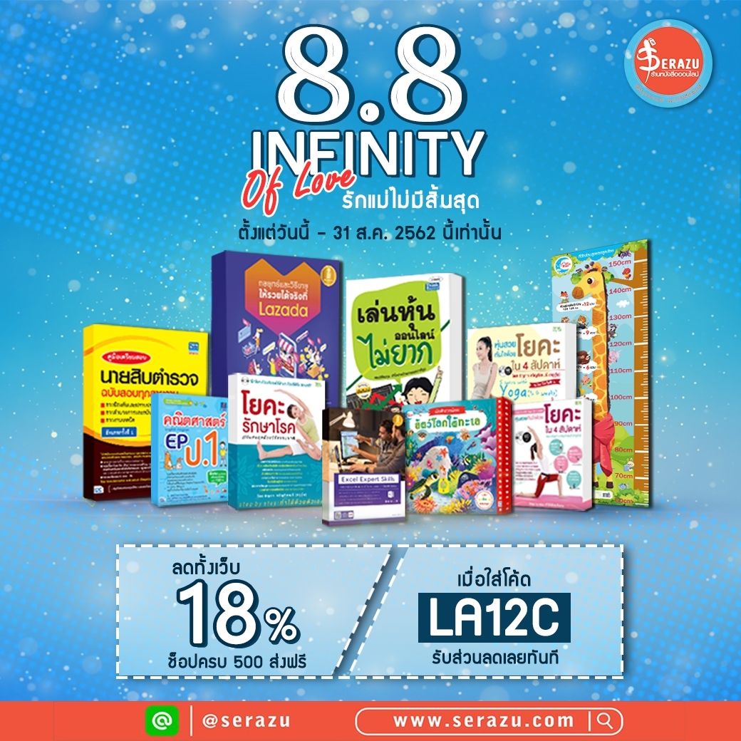 อนสิงหาคมปี 2562 เดือนแห่งวันแม่ เซราสุ จัดโปรโมชั่น 8.8 infinity of love รักแม่ไมมีสิ้นสุด ลดทั้งเว็บ พิเศษสุดๆ เลือกช้อปหนังสือกันอย่างไม่สิ้นสุดตลอด 24 ชั่วโมง
