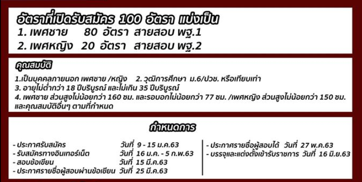 อัตราที่เปิดรับสมัคร 100 อัตราแบ่งเป็น - ชาย 80 อัตรา สายสอบ พฐ. 1