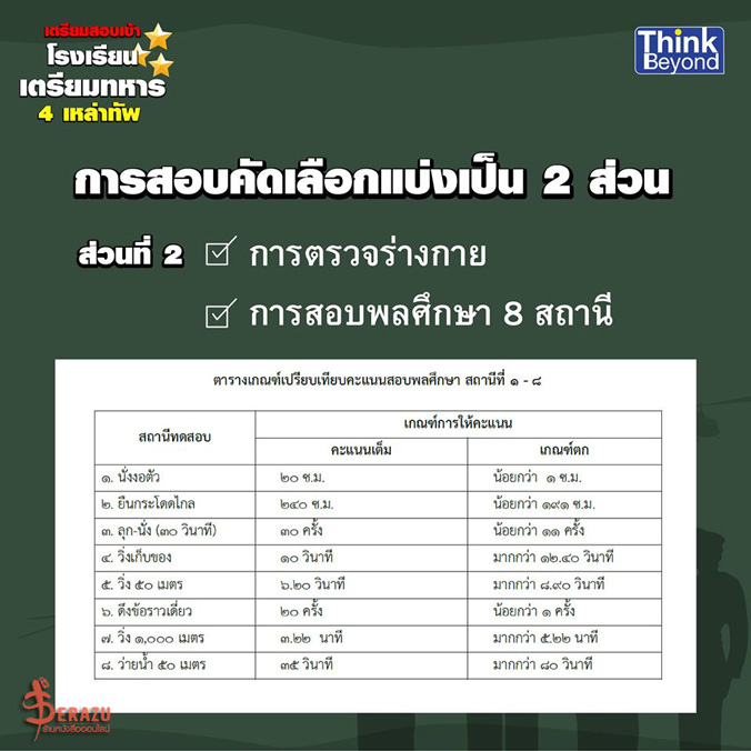 2.สอบสมรรถภาพร่างกายและสัมภาษณ์ซึ่งในการสอบส่วนที่ 1 ของแต่ละเหล่าทัพนั้นมีดังนี้