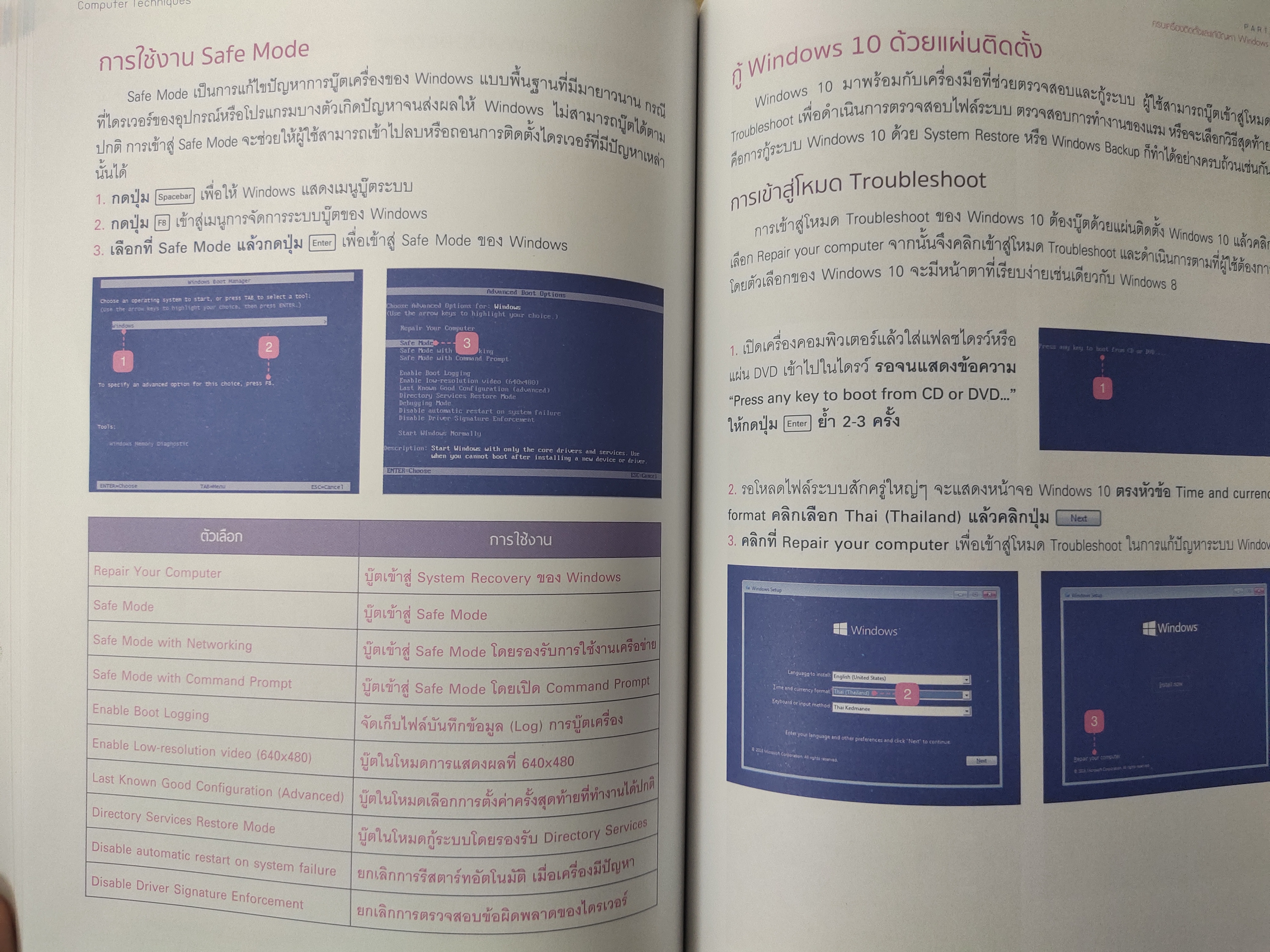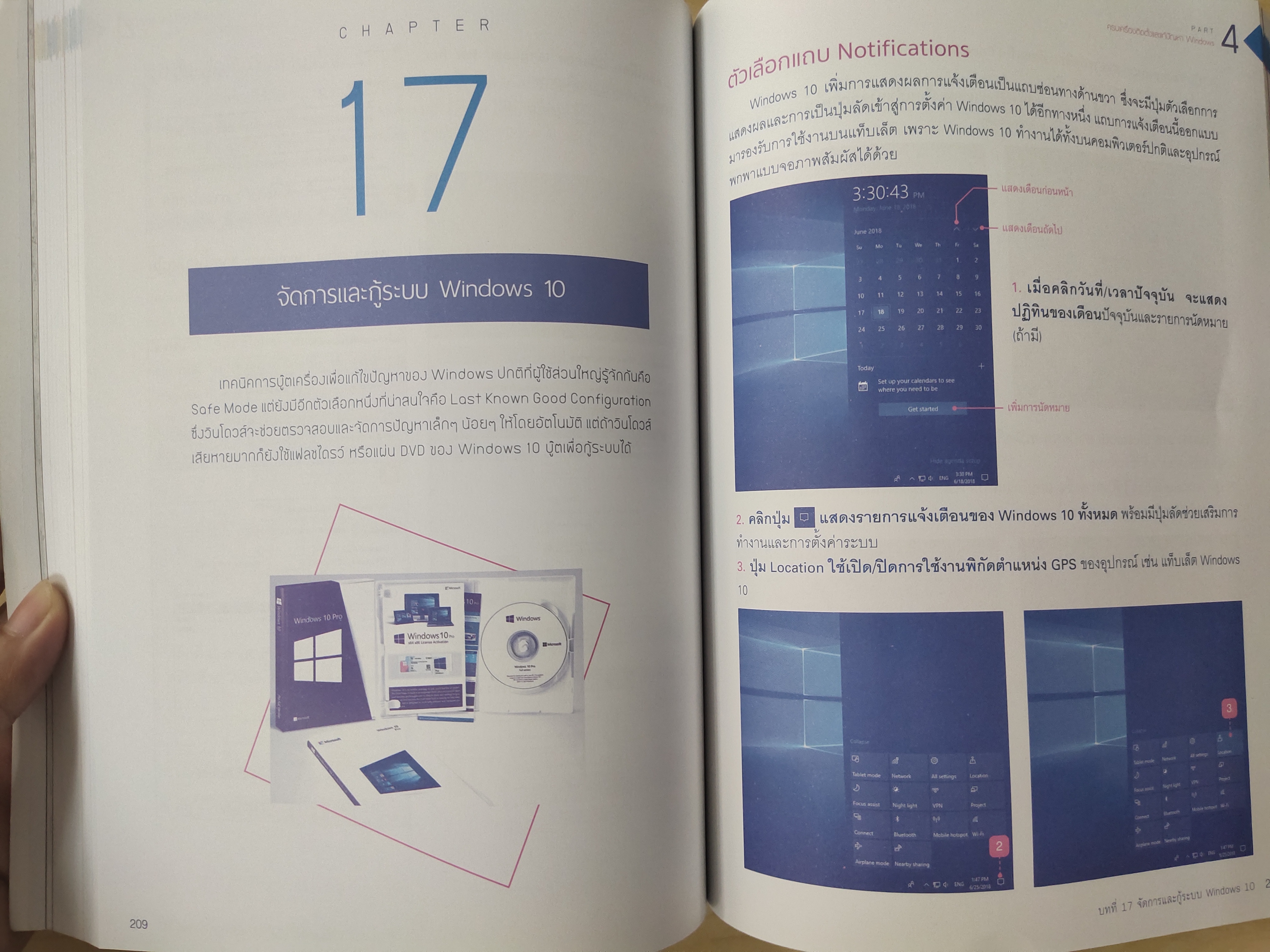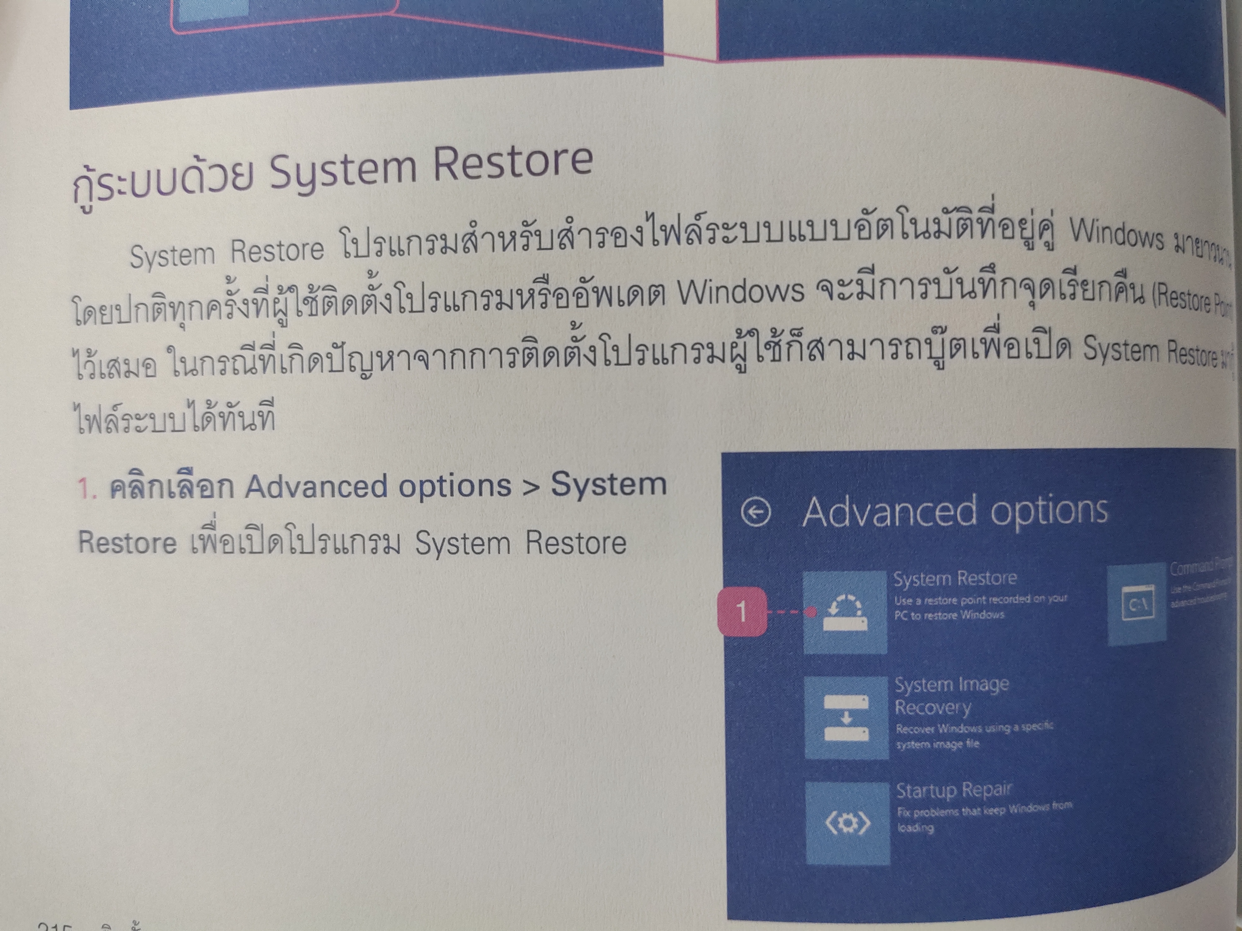 ตัวอย่างแก้ไขปัญหาที่ 2 ( กู้ระบบด้วย System Restore ) การแก้ปัญหาด้วย ฟีเจอร์ System Restore นี้จะทำให้ท่านสามารถคืนเครื่องคอมพิวเตอร์ไปสู่สถานะที่เป็นปกติเหมือนเดิม ในกรณีที่คอมพิวเตอร์มีปัญหา ให้ทำตามขั้นตอนต่าง ๆ ในหนังสือเล่มนี้ ! เพื่อดำเนินการ กู้ระบบด้วย System Restore ให้ Windows กลับมาเป็นปกติ