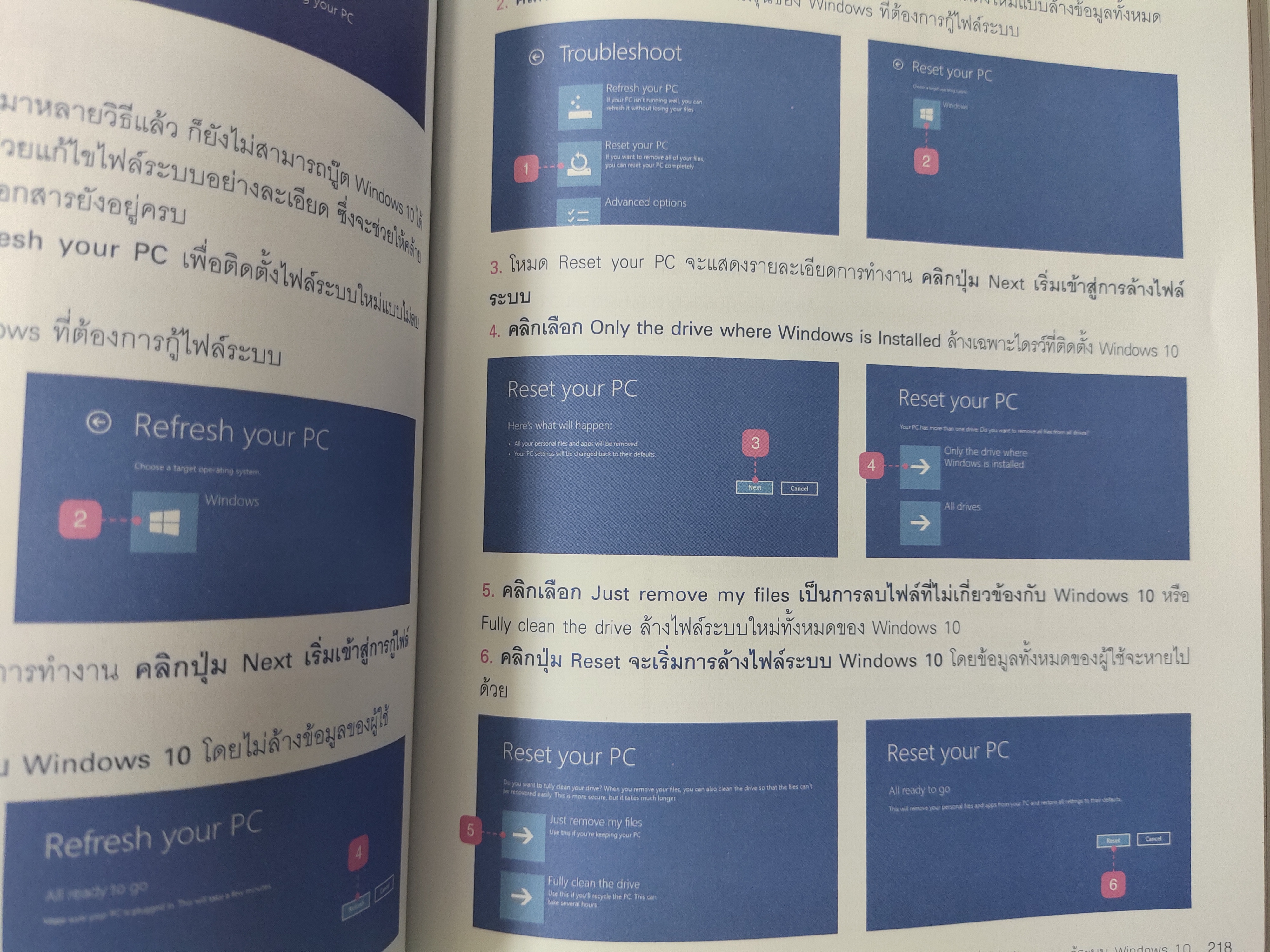 ตัวอย่างแก้ไขปัญหาที่ 3 ( ล้างระบบ Windows ) วิธีการล้างระบบ Windows ให้ใหม่เอี่ยม หากแก้ปัญหา Windows ด้วยสารพัดวิธีก็แล้วยังไม่สามารถใช้งานได้ตามปกติ Microsoft จึงเสนอทางเลือกสุดท้ายคือการล้างระบบ Windows ทั้งหมดให้ใหม่เอี่ยมเหมือกับการล้างเครื่อง แต่วิธีนี้จะล้างไฟล์งานและข้อมูลทั้งหมดของผู้ใช้ด้วย ดังนั้นจะต้องสำรองของมูลไว้ก่อนสมอ