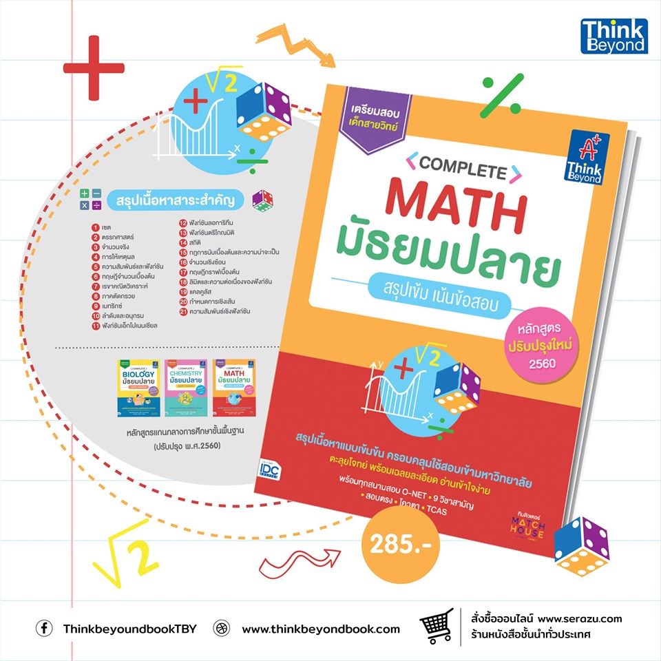 หนังสือ "Complete Math มัธยมปลาย สรุปเข้ม เน้นข้อสอบ" เล่มนี้ จะช่วยให้น้องๆ ได้ฝึกคิดและทำโจทย์หลากหลาย สรุปเนื้อหาครบถ้วน ใช้ภาษาที่เข้าใจง่ายที่สุด