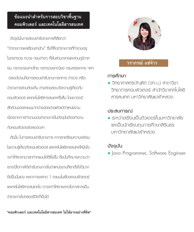 เป็นหนังสือรวมแนวข้อสอบพื้นฐานคอมพิวเตอร์และเทคโนโลยีสารสนเทศ มีสรุปเนื้อหาที่สำคัญและออกสอบบ่อยครั้ง ครอบคลุมเนื้อหาที่ออกสอบในการสอบเข้ารับราชการทุกสังกัด