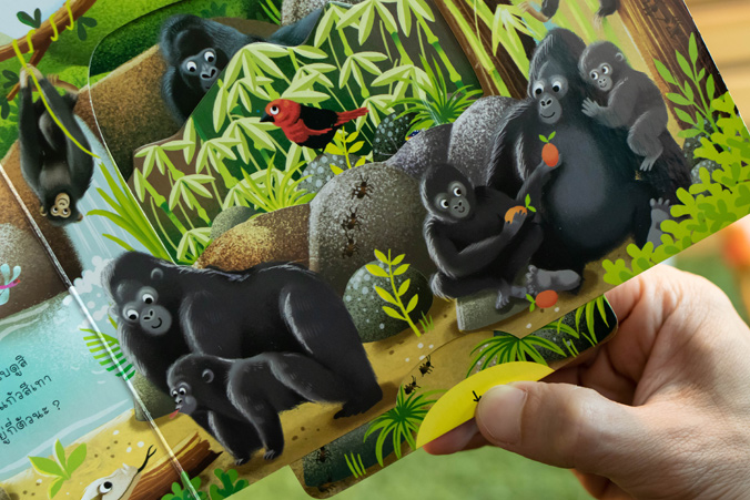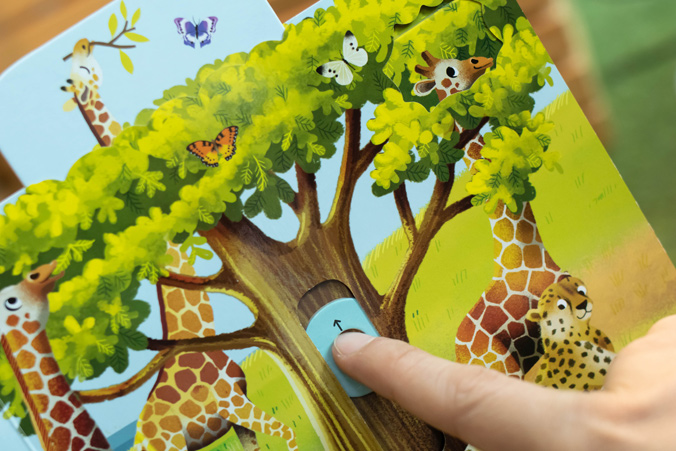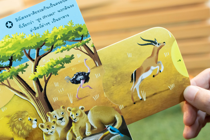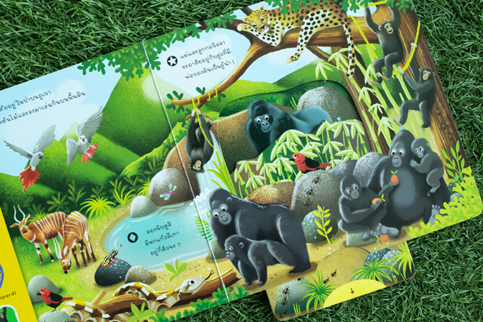 พร้อมกับแถบกลไกสำหรับดึง หมุน ดัน เลื่อน ที่จะช่วยให้สัตว์ต่างๆ ในภาพดูมีชีวิตชีวามากยิ่งขึ้น เด็กๆ จะได้ทั้งความรู้ ความสนุก และเข้าใจธรรมชาติรอบตัวได้ดียิ่งขึ้น