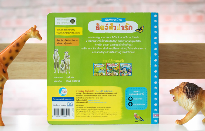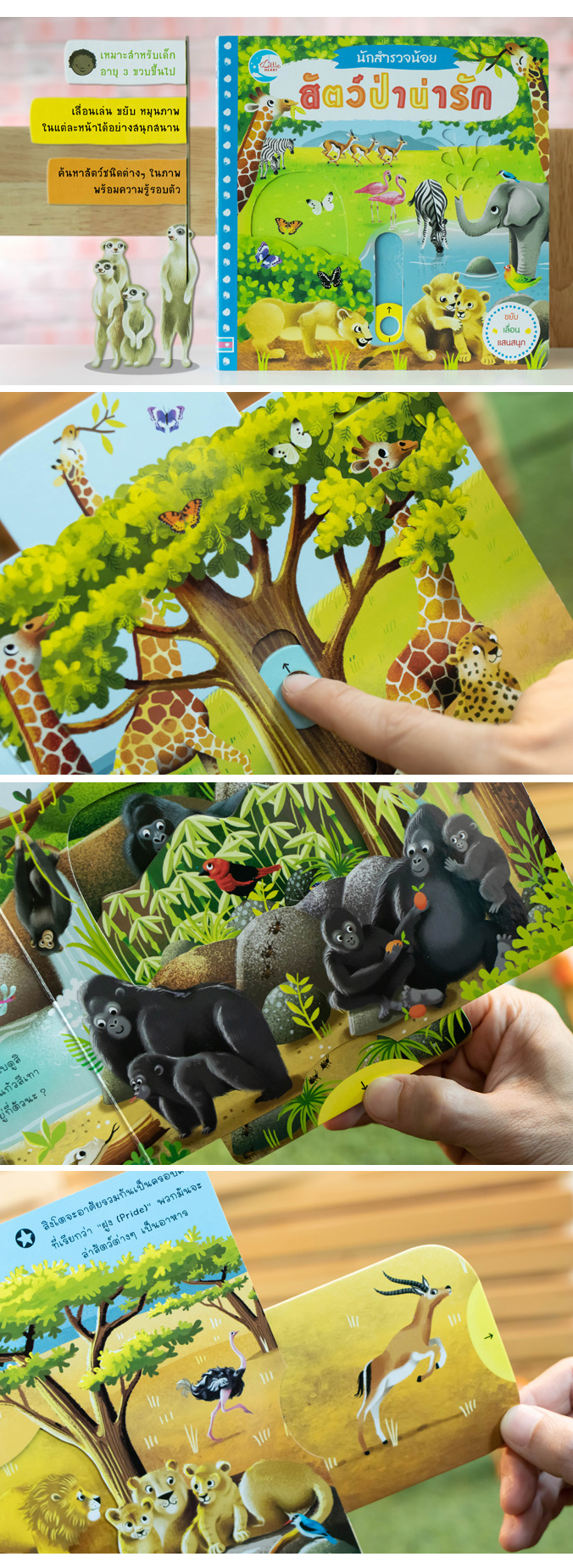 ผจญภัยสำรวจเข้าไปในดินแดนแห่งป่า และทุ่งหญ้าเพื่อพบกับสัตว์ป่าที่น่ารักจำนวนมากไม่ว่าจะเป็น สิงโต ยีราฟ ม้าลาย ช้าง และอีกมากมาย พร้อมกับแถบกลไกสำหรับดึง หมุน ดัน เลื่อน ที่จะช่วยให้สัตว์ต่างๆ ในภาพดูมีชีวิตชีวามากยิ่งขึ้น เด็กๆ จะได้ทั้งความรู้ ความสนุก และเข้าใจธรรมชาติรอบตัวได้ดียิ่งขึ้น
