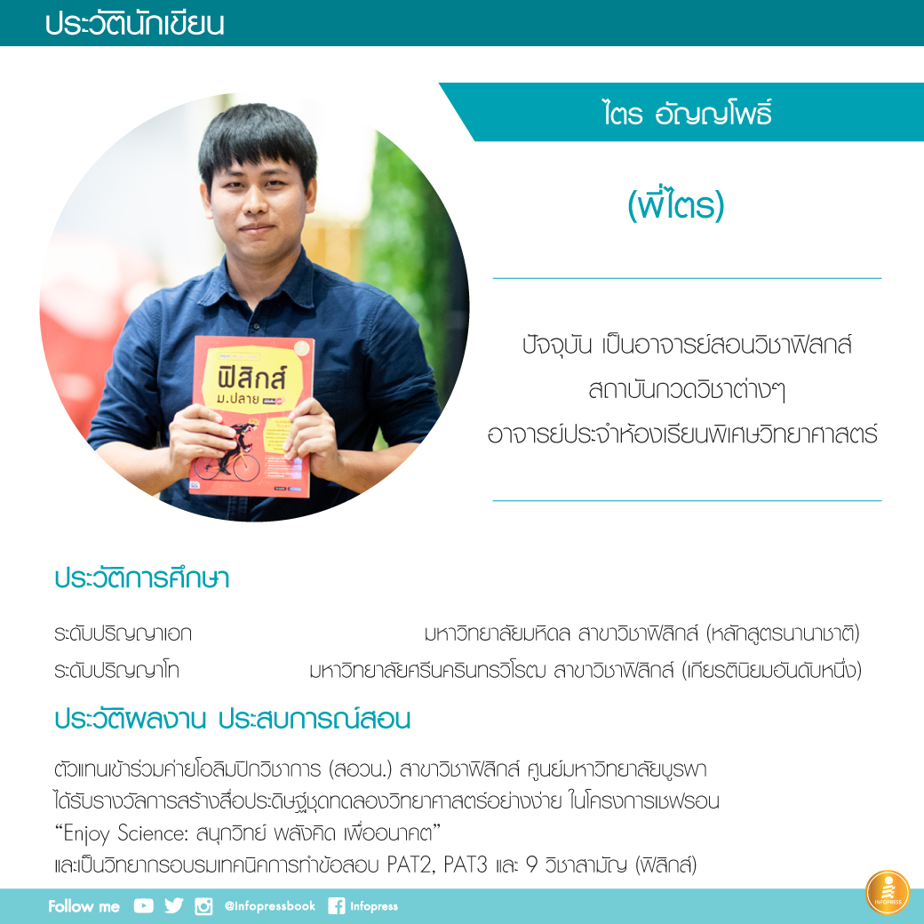 สรุปเนื้อหาฟิสิกส์ระดับชั้น ม.ปลาย รายวิชาพื้นฐานและเพิ่มเติม ทั้งรูปแบบตาราง ภาพประกอบที่สื่อชัดเจนต่อการอ่าน ยกตัวอย่างเสริมเข้าใจในหัวข้อที่ยากและออกสอบบ่อย ข้อสอบท้ายบทที่คัดเลือกมาจากแนวข้อสอบจริงทุกสนามสอบ O-NET, PAT2, PAT3, วิชาสามัญ ฯลฯ พร้อมอธิบายวิธีการทำข้อสอบแบบละเอียดชัดเจน เหมาะสำหรับนักเรียนตั้งแต่ชั้น ม.4-ม.6 ทุกสายการเรียน เพื่อใช้อ่านทบทวนเนื้อหาและต้องการฝึกทำข้อสอบ เพื่อเพิ่มคะแนนสอบวิชาฟิสิกส์ในทุกสนามสอบ