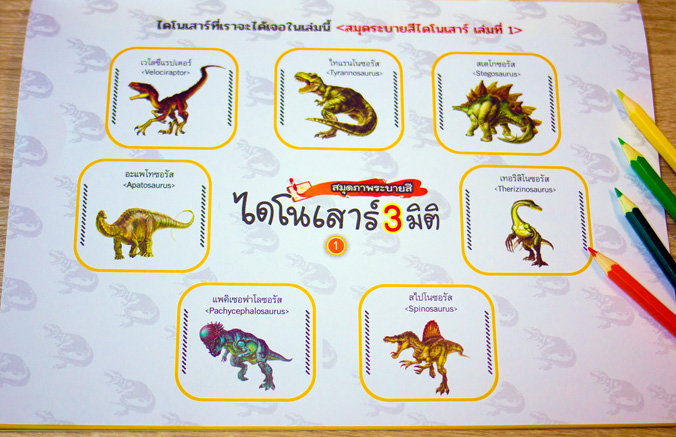 สมุดภาพระบายสีไดโนเสาร์แสนสนุกที่มาพร้อมกับแอพพลิเคชั่นเทคโนโลยีภาพเสมือนจริง เพียงนำแอพพลิเคชั่นส่องไปที่ไดโนเสาร์ซึ่งระบายสีเอาไว้เรียบร้อยแล้ว ไดโนเสาร์เสมือนจริงจะปรากฏขึ้นมาภายในหน้าจอสมาร์ทโฟนทันที พร้อมทั้งมีสีและลวดลายเหมือนกับที่เราได้ระบายสีเอาไว้ ฝึกทักษะ พร้อมความสนุกไปกับไดโนเสาร์มากมายได้แก่ ไทแรนโนซอรัส, เวโลซีแรปเตอร์, อะแพโทซอรัส, แพคิเซอฟาโลซอรัส, สไปโนซอรัส, เทอริสิโนซอรัส และ สเตโกซอรัส