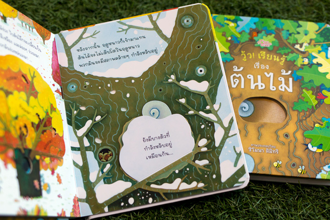 เมื่อเด็กๆ ได้พลิกเปิดดูสิ่งที่ซ่อนอยู่ภายใต้ใบไม้ และกิ่งไม้ทั้งหลาย เด็กๆ ก็จะพบว่ามีกระรอกน้อยแอบนอนหลับอยู่ หรือแมลงต่างๆ กำลังคลานกระดืบกระดืบ และยังมีเรื่องราวที่น่าสนใจเกี่ยวกับต้นไม้อีกมากมายให้เรียนรู้ เด็กๆ จะได้สนุกไปกับการพลิกเปิดแผ่นปิดจำนวนมาก พร้อมทั้งแอบมองลอดช่องเจาะต่างๆ เพื่อพบกับเรื่องราวที่น่าประหลาดใจ ได้รู้ว่าการที่ต้นไม้จะเติบโตขึ้นมานั้น มีอะไรบ้างที่จำเป็นสำหรับมัน จะเกิดอะไรขึ้นเมื่อฤดูการผันเปลี่ยนไป มาเถอะมาผจญภัยไปด้วยกัน​