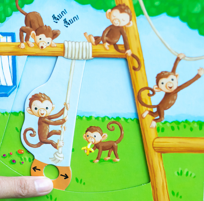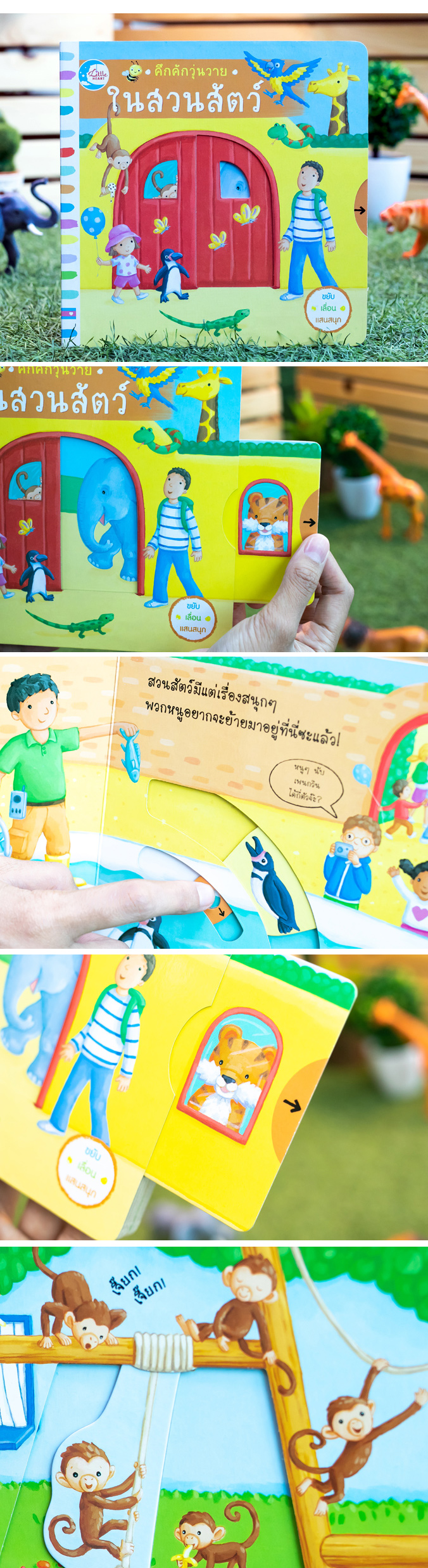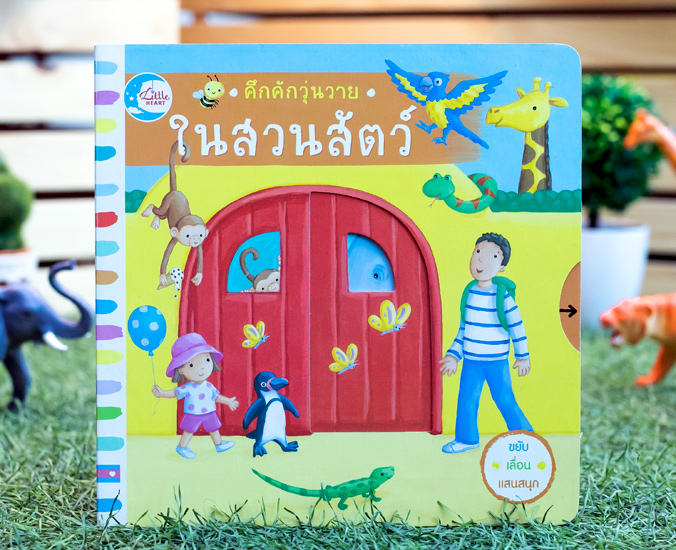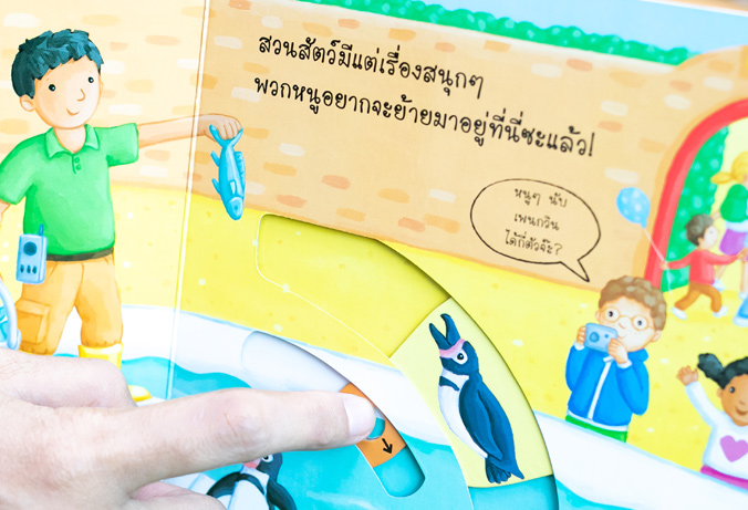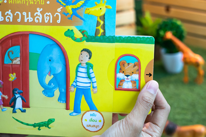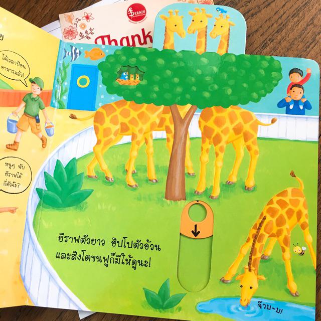 หนังสือเรื่องราวในสวนสัตว์ที่มีหลายสิ่งหลายอย่างให้เล่นสนุก เด็กๆ จะได้ดึงตรงนั้น ดันตรงนี้ และจับหมุนๆ เพื่อพบกับสัตว์ต่างๆ ที่อยู่ในสวนสัตว์ เด็กๆ จะได้ดันหัวยีราฟให้ทะลุพ้นยอดต้นไม้ พ่นน้ำให้เจ้าช้าง ดูความซุกซนของเจ้าลิงตัวน้อย และป้อนอาหารให้กับเพนกวินอย่างสนุกสนาน
