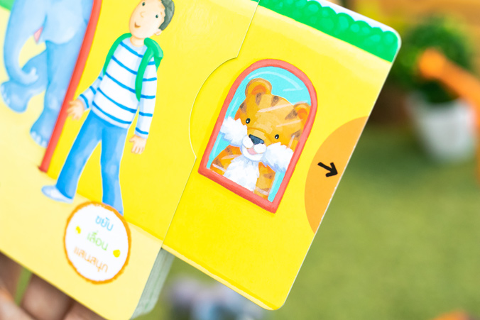 หนังสือบอร์ดบุ๊คที่มีกลไก ขยับ เลื่อน แสนสนุก เล่าเรื่องเกี่ยวกับสัตว์ต่างๆ ที่อยู่ในสวนสัตว์ ให้เด็กๆ ได้เล่นพร้อมเรียนรู้