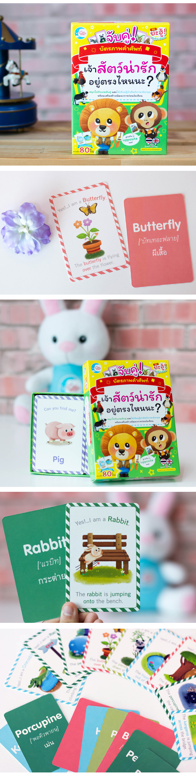 เด็กๆจะได้เรียนรู้จักตำแหน่งต่างๆจากสัตว์หลากหลายชนิด เป็นก้าวแรกของการเรียนรู้ที่ บัตรภาพคำศัพท์จับคู่จะช่วยพัฒนาทักษะสมองทั้งซึกซ้ายและขวาอย่างสมดุล ทำให้มีความพร้อมรอบด้านในการพัฒนาทักษะการเรียนรู้ต่างๆของเด็กได้เป็นอย่างดีและยังเสริมสร้างความสัมพันธ์ในครอบครัว เด็กๆจะได้เรียนรู้คำศัพท์ ทั้งภาษาไทย และภาษาอังกฤษ สนุกกับการจับคู่บัตรภาพคำศัพท์พร้อมกับโปสเตอร์สีสันใส น่ารัก น่าเรียนรู้