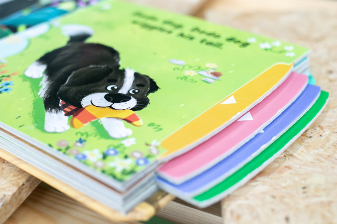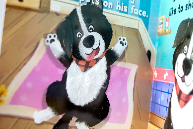 ** หนังสือบอร์ดบุ๊คภาษาอังกฤษอ่านง่าย พร้อมตัวการ์ตูนหมาน้อยขยับได้ และมีส่วนสัมผัสได้เพื่อเสริมพัฒนาการเด็กน้อย **