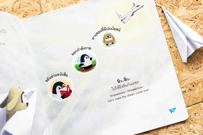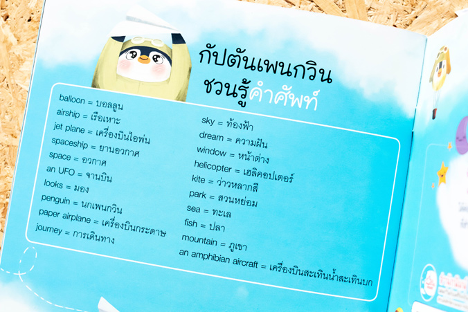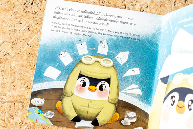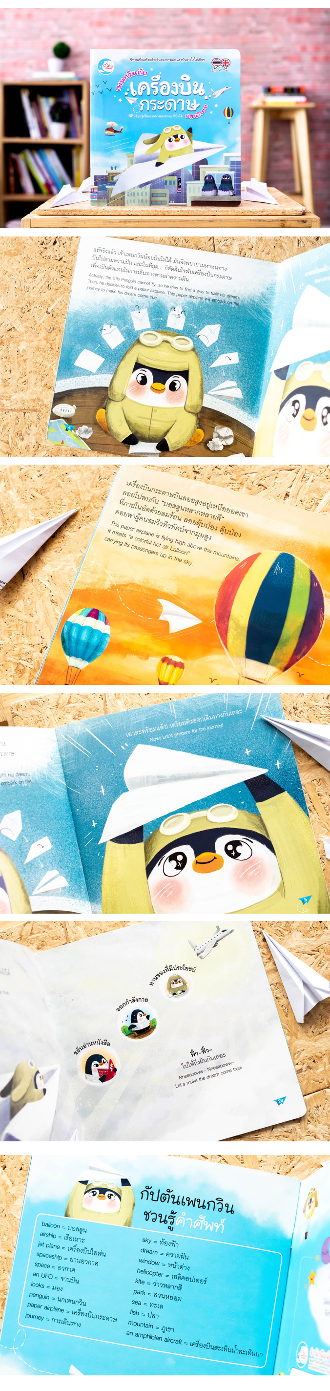 นิทานภาพสองภาษาเพื่อเสริมสร้างจินตนาการและแรงบันดาลใจให้เด็กๆ ได้ต่อยอดความรู้และเป็นแรงขับเคลื่อนที่สำคัญต่อการทำสิ่งต่างๆในอนาคต เด็กๆจะได้เรียนรู้จักยานพาหนะต่างๆที่บินได้ไปพร้อมๆกับตัวละครสุดน่ารักกัปตันเพนกวินน้อยที่มีความมุ่งมั่นตั้งใจหาหนทางเพื่อที่จะบินให้ได้สักครั้งหนึ่งในชีวิต ทำให้เด็กๆเห็นถึงความตั้งใจส่งต่อเป็นพลังในการทำสิ่งต่างๆที่เค้าอยากจะทำช่วยสร้างความภาคภูมิใจในตัวเอง เหมาะสำหรับให้คุณแม่คุณพ่ออ่านให้ฟังอย่างสนุกสนานด้วยกันในทุกๆวัน