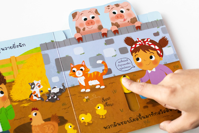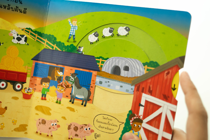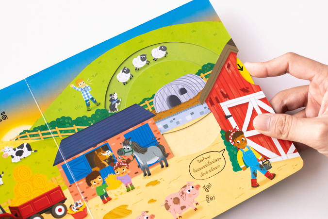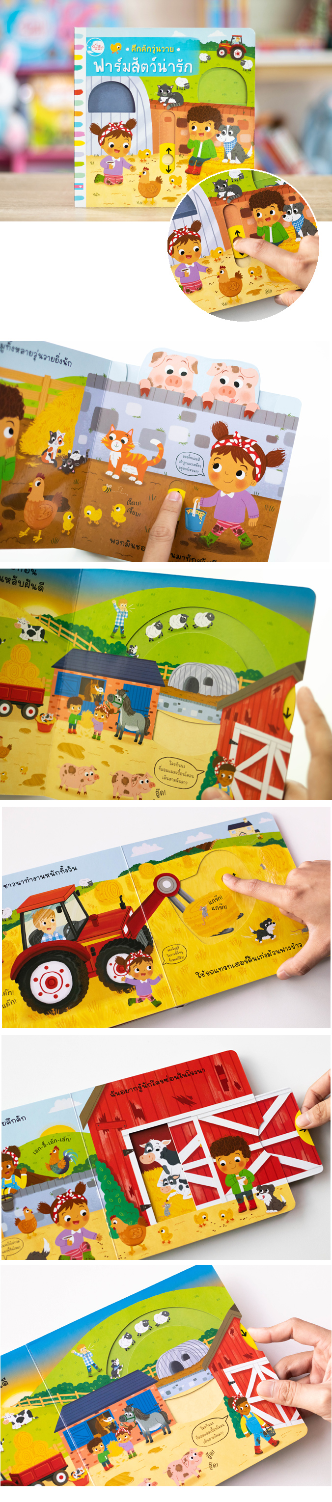 มีเรื่องราวเกิดขึ้นมามายในฟาร์มสัตว์ ไม่ว่าจะเป็นเจ้าหมูที่วุ่นวาย วัวน้อยที่นอนหลับ ไก่กุ๊กที่หาอาหาร แกะขนฟูที่วิ่งเล่นไปมา นอกจากนั้นยังมีสัตว์อื่นๆ อีกเป็นจำนวนมากให้เด็กๆ ได้ค้นหา สังเกต นับจำนวน และสนุกไปกับกลไกดึง หมุน ดัน เลื่อน จับขยับได้อย่างน่าตื่นตาตื่นใจ