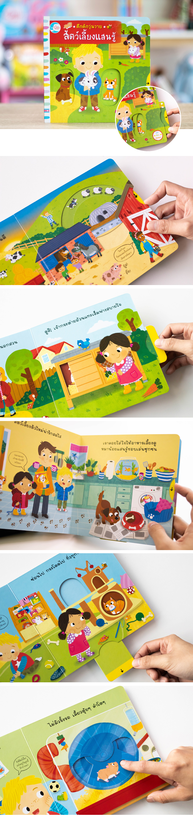นิทานกลไกบอร์ดบุ๊คกลไก เรื่องราวกิจกรรมต่างๆ ของสัตว์เลี้ยงหลายชนิด ให้เด็กๆ ได้สนุกกับความน่ารักของสัตว์เลี้ยง
