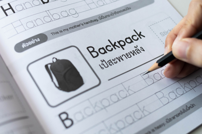 หนังสือแบบฝึกหัดคัดที่มีระดับความท้าทายง่าย-ยาก สำหรับการเรียนรู้คำศัพท์ภาษาอังกฤษ พร้อมคำแปลภาษาไทย มีรูปภาพ แถมฟรีสติกเกอร์ฝึกทักษะ และตัวอย่างการใช้คำต่างๆ ในประโยค
