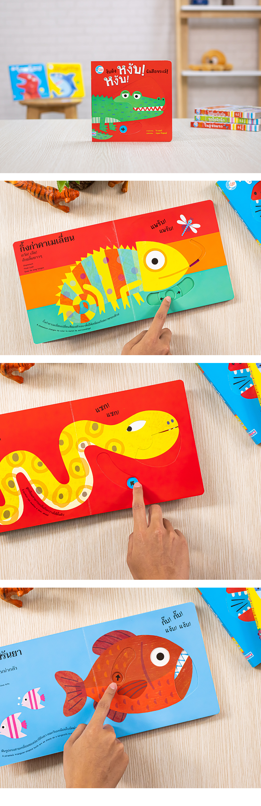 หนังสือจับขยับแสนสนุก ให้เด็กๆ ได้สนุกไปกับการจับจระเข้อ้าปากงับๆ กิ้งก่าแลบลิ้นแพรบๆ พร้อมเรื่องราวของสัตว์ชนิดนั้นๆ
