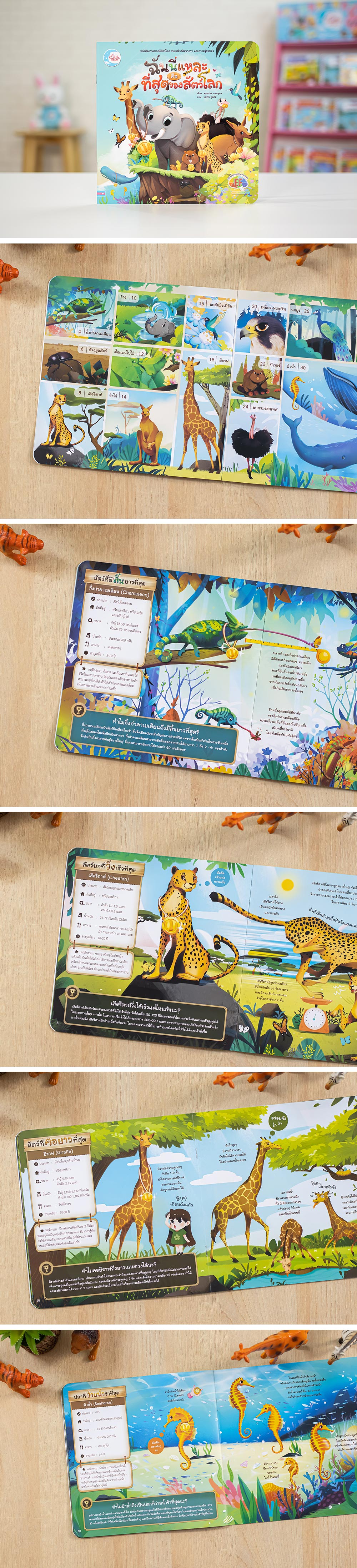 หนังสือภาพสารคดีสัตว์โลกสุดแสนน่ารัก ช่วยเสริมพัฒนาการและความรู้รอบตัว ที่จะทำให้เด็กๆ ได้เรียนรู้จักกับสัตว์นานาชนิดที่มีคุณลักษณะพิเศษเฉพาะตัว จนกลายเป็นที่สุดของสัตว์โลกในแต่ละด้าน อย่างกิ้งก่าคาเมเลียนเป็นสัตว์ที่มีลิ้นยาวที่สุด ยาวได้ถึงเท่าไหร่กันนะ? และมีลิ้นยาวไว้ทำไม
