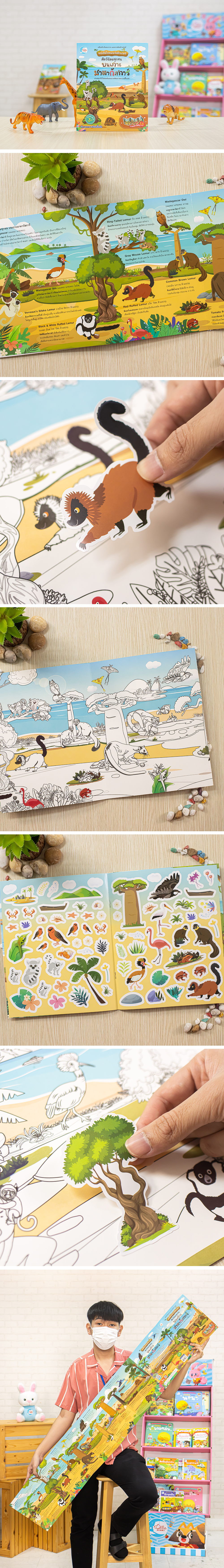 หนังสือที่มีความยาวถึง 1.5 เมตร ให้เด็กๆ ได้สนุกไปกับภาพประกอบอย่างต่อเนื่องและเรียนรู้เรื่องราวของสัตว์นานาชนิดบนเกาะมาดากัสการ์ ว่ามีสัตว์ชนิดใดบ้างอาศัยอยู่บ้าง แต่ละตัวเรียกว่าอะไร และมีจุดเด่นหรือความสามารถพิเศษยังไง และด้านหลังจะมีพื้นที่ให้เด็กๆ ได้ระบายสีและติดสติกเกอร์ ช่วยฝึกและกระตุ้นพัฒนาการเด็กได้รอบด้าน
