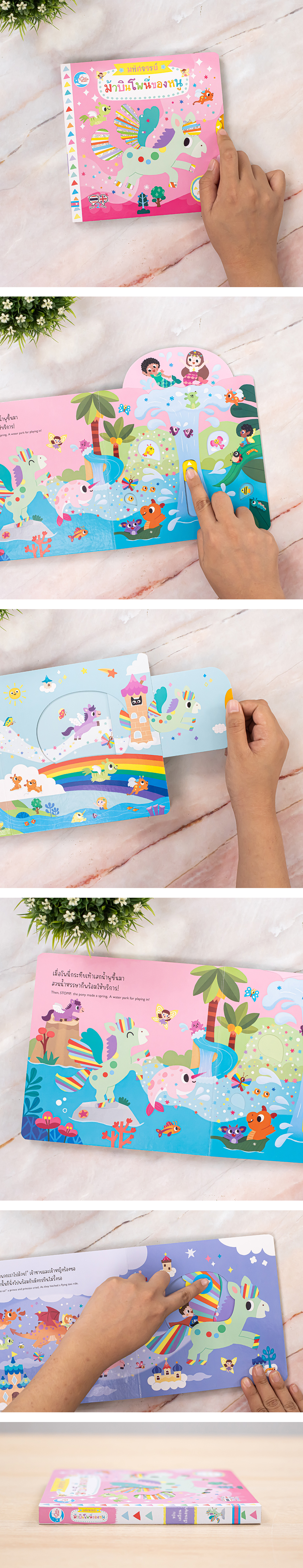 โพนี่บินได้แสนมหัศจรรย์ มาพาเด็กๆ ให้บินเที่ยวไปบนท้องฟ้า พร้อมภูติน้อยตัวจิ๋ว เจ้าชายเจ้าหญิงแสนสวยงาม และพบกับเวทย์มนต์เสกน้ำพุลอยพุ่งขึ้นท้องฟ้า เด็กๆ จะได้สนุกไปกับจินตนาการสีสวยหวาน พร้อมขยับเคลื่อนเลื่อนสนุกไปกับกลไกภายในเล่ม