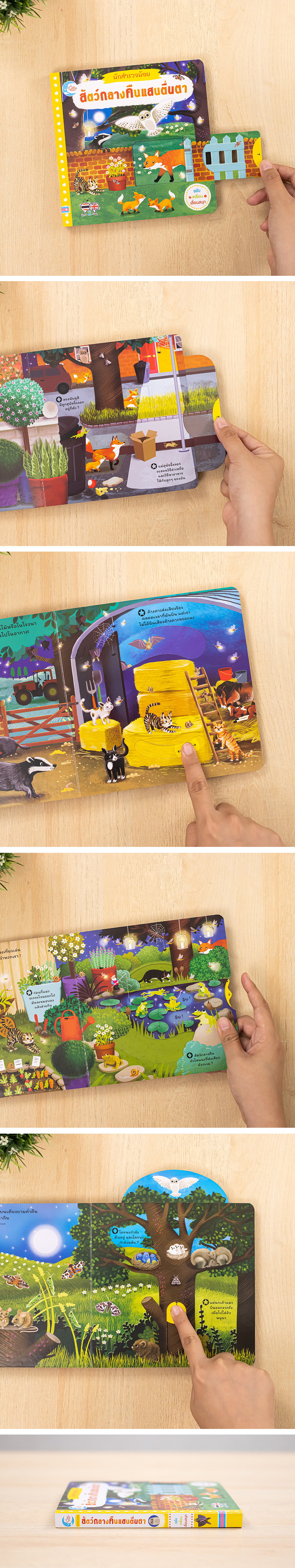 สัตว์หลายชนิดนอนในเวลากลางวัน และออกหากินในเวลากลางคืน สัตว์เหล่านี้หากินกันอย่างใรในที่มืดๆ นะ แล้วเขากินอะไรเป็นอาหารกันล่ะ สัตว์บางตัวมีท่าทางแปลกๆ แต่น่ารัก พาเด็กๆ ได้เปิดโลกกลางคืนผ่านการขยับเลื่อนแผ่นกลไกภายในเล่มกันเถอะ