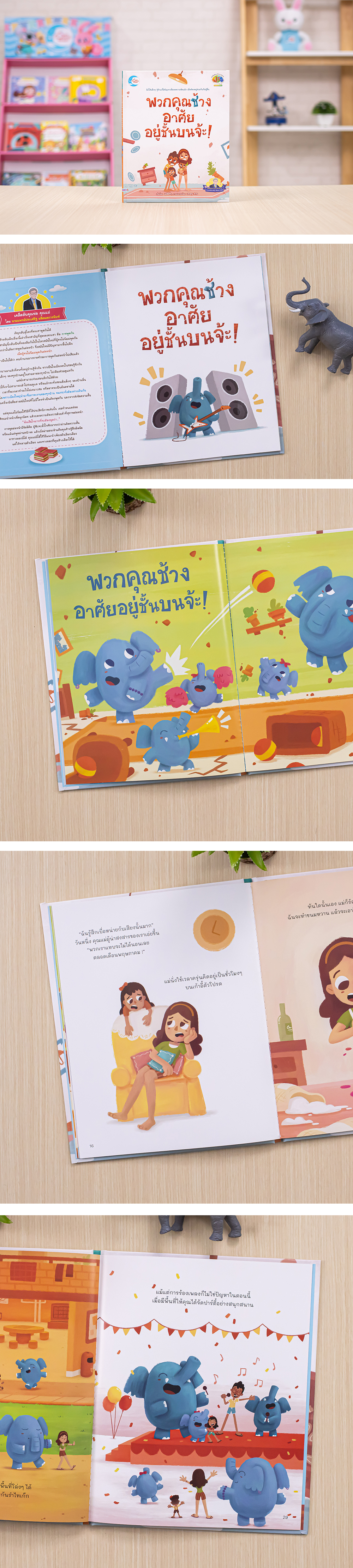 นิทานภาพสุดน่ารัก ของครอบครัวช้าง และผู้อยู่อาศัยในชุมชนเดียวกัน ซึ่งในบางครั้งครอบครัวช้างอาจจะทำเสียงดังโครมครามไปบ้างโดยที่ไม่รู้ตัว นิทานเรื่องนี้ี่จะสอนและฝึกให้เด็กๆ รู้จักทักษะในการสื่อสาร แก้ไขปัญหาอย่างนุ่มนวลเพื่อลดความขัดแย้ง เมื่อต้องอยู่ร่วมกับผู้อื่น